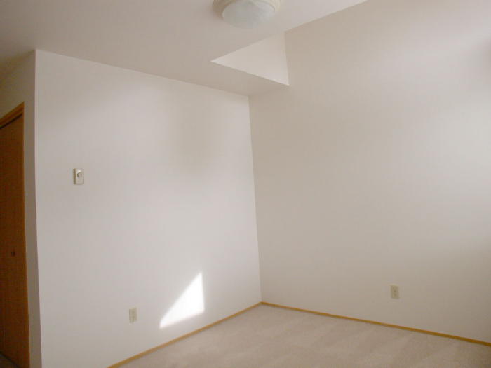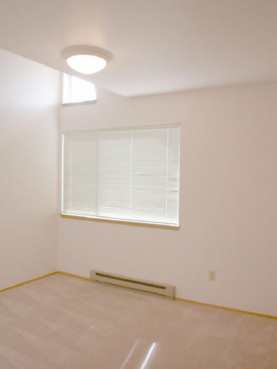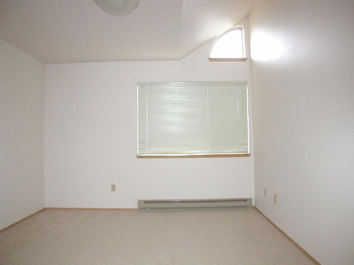 This photo shows part of the large first bedroom with vaulted ceiling and additional custom window.