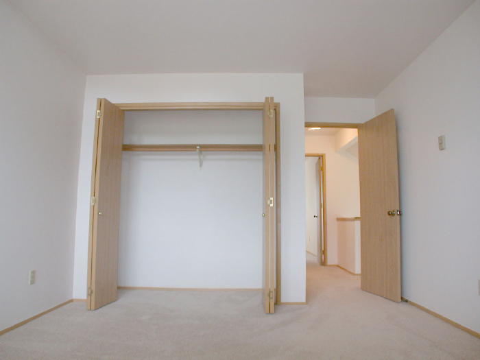 Two views of the sunny second bedroom with vaulted ceiling and additional custom window, and large closet.