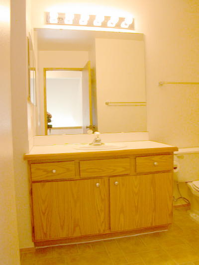 These views show part of the extra large hall bathroom wood cabinet and lots of lighting.