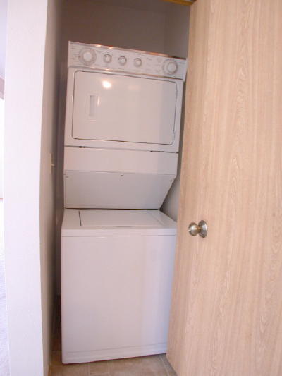 This view shows the full size stacked washer and dryer in the laundry closet that is featured in each of the units.