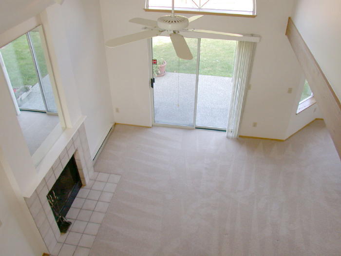 Upper level view of the vaulted living room shows the wall-to-wall carpeting and the large ceiling fan