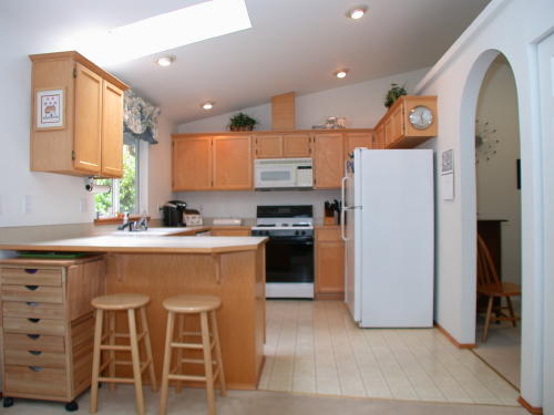 The kitchen has an eat-in counter / work space, lots of lighting, lots of wood cabinets storage space and vaulted ceiling.