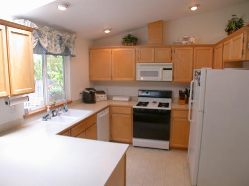 Large bright kitchen that features: Wood cabinets, lots of counter top work space, plenty of storage spaces, and separate eat-in kitchen counter space. Appliances include: Refrigerator, gas cook top and oven, dishwasher, deep ceramic sink and garbage disposal.