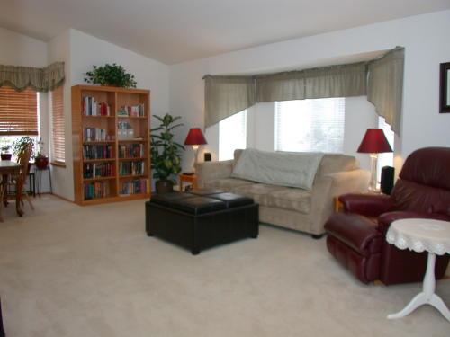 Photo of the sun filled West facing living room with large bay window, vaulted ceiling and open floor plan.