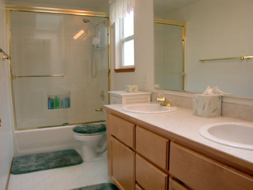 The full bath master bath has double sinks, lots of wood storage cabinet space, counter top, and large mirror.