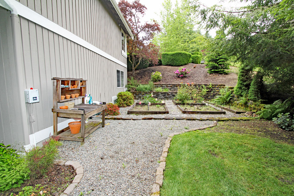 The south side of the house has a sunny raised garden area with gravel walkways.