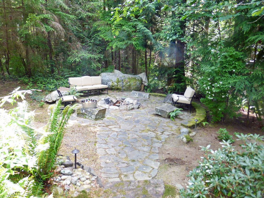 This photo over looks the hidden fire pit with camp ground setting and stone seats.