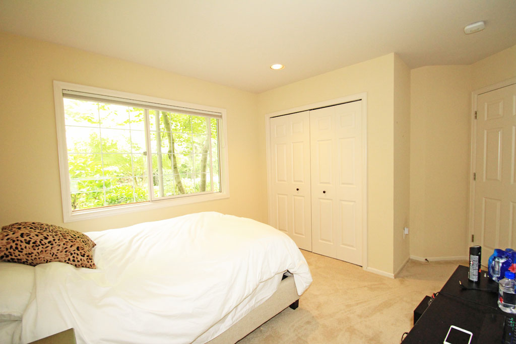 This photo of the fourth bedroom shows the large window and double bi-folding closet doors.
