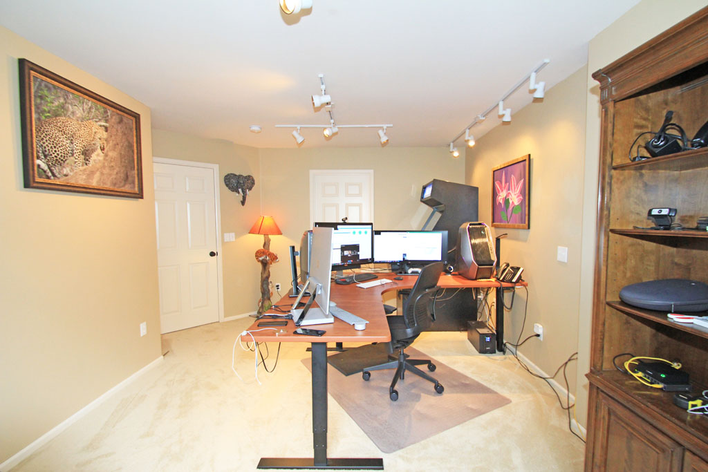 The den/office has a large window with a pleasant view of the raised garden, wall-to-wall carpeting, and lots of lighting.