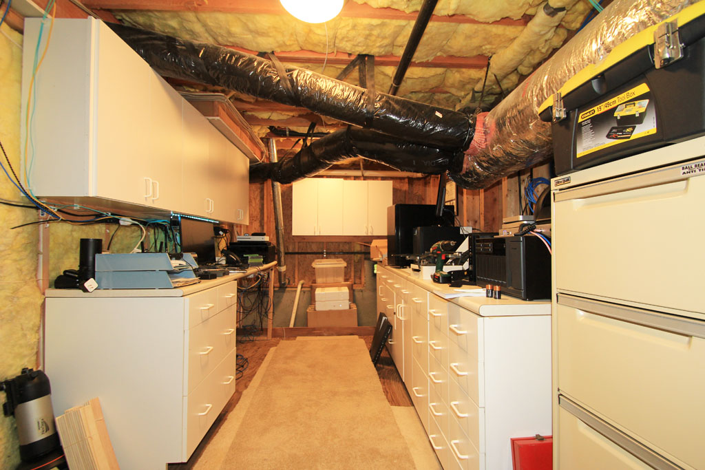 A full size interior door provides access to the extra large walk-in storage area in the crawl space that is being used as a project work space.