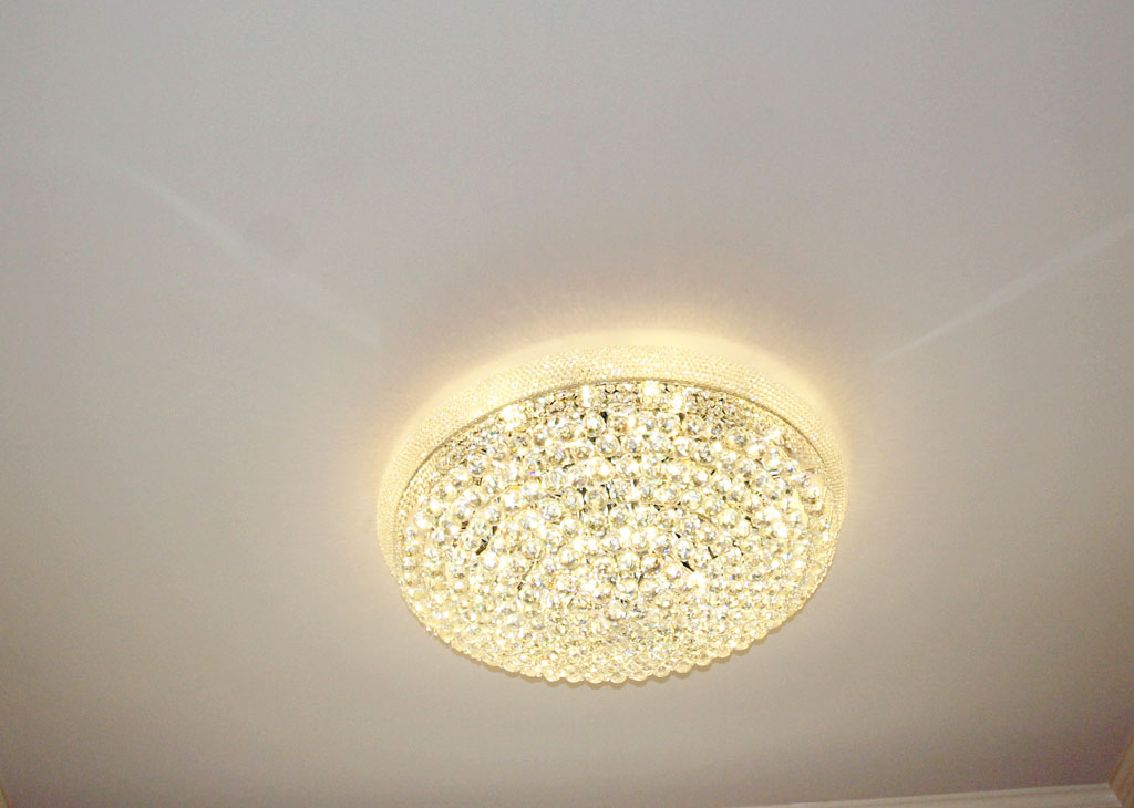 Close up photo of the new ceiling Crystal light fixture in the front entry.