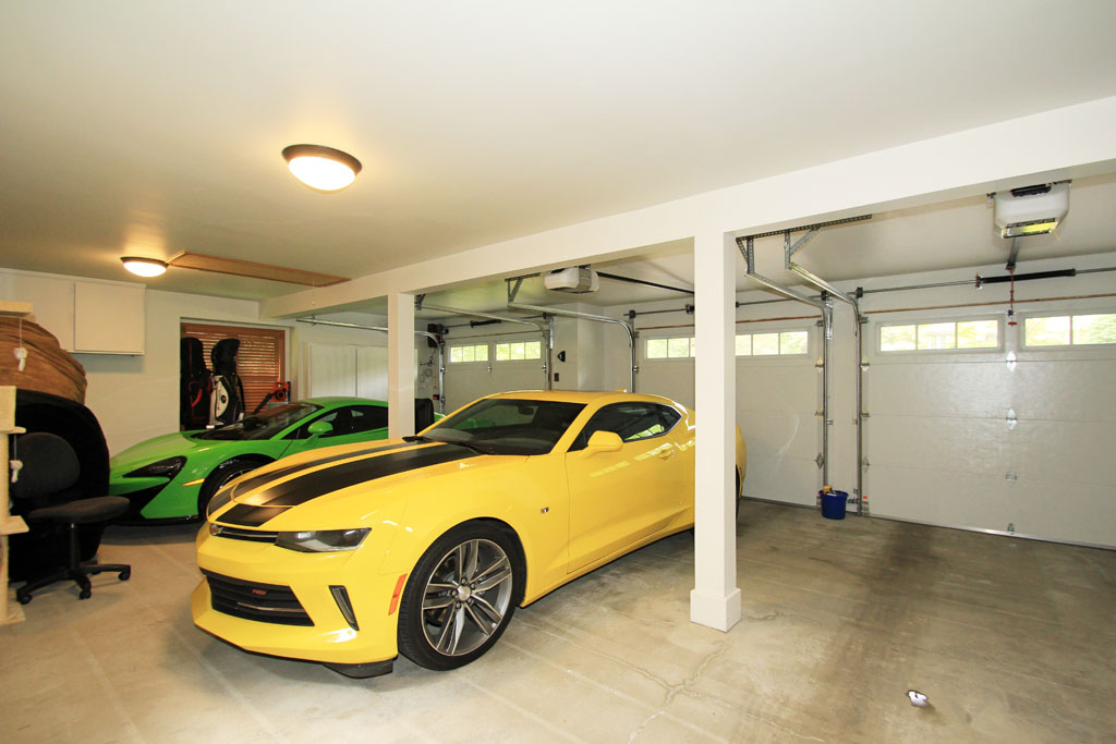 View of the large finished three car garage with three new insulated garage doors with windows and pull down stairs that lead to attic storage space.
