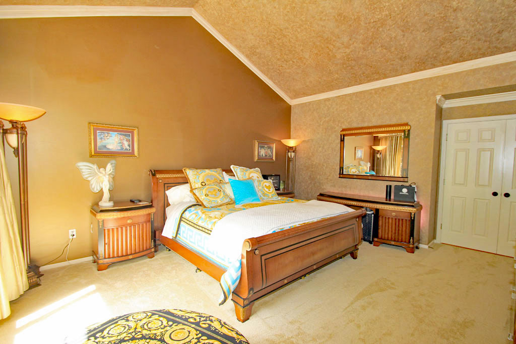 This second photo of the master bedroom shows the custom paint, crown molding and wall-to-wall carpeting.