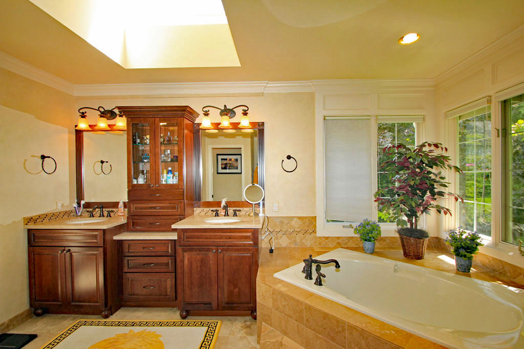 The open master bathroom has a large skylight, custom vanity with Marble counter top, under counter sinks, and deep soaking tub with Marble tile trim